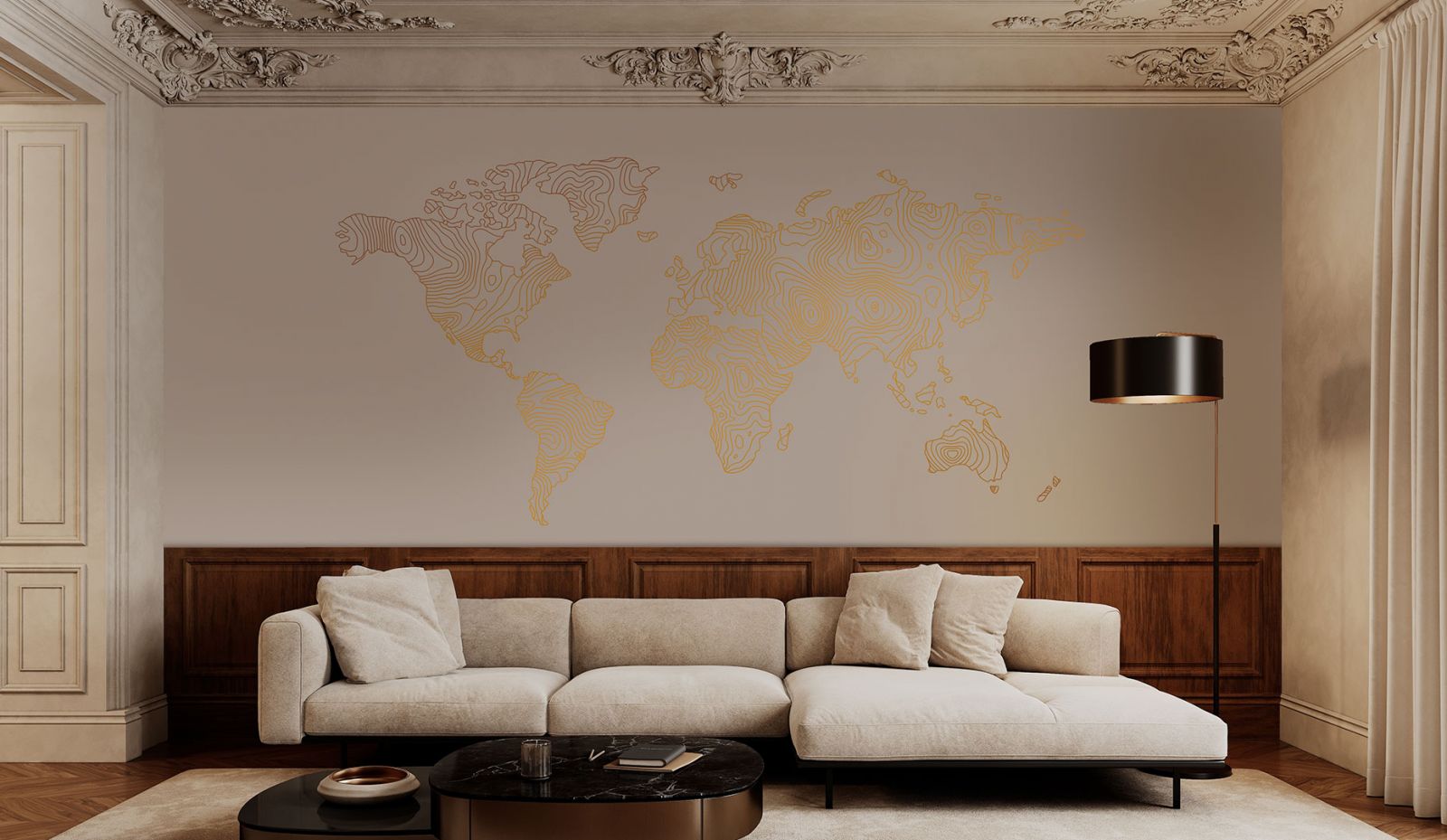 Между стеной и потолком, зачастую монтируют резные плинтуса и молдинги – так оформление станет более благородным и дорогим.